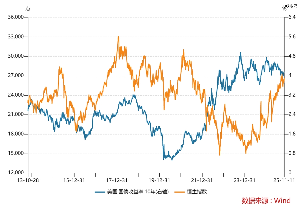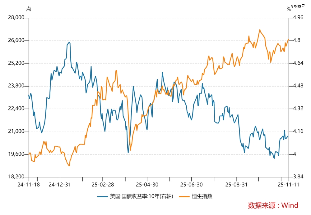 自2025年8月以来,美国10年期国债收益率持续下行,一度跌破4%,全球流动性边际改善。这对一个资金自由流动、美元计价的市场来说,无疑是“利好”,但现实却是,恒指不升反跌,成交量萎缩,个股回调明显。