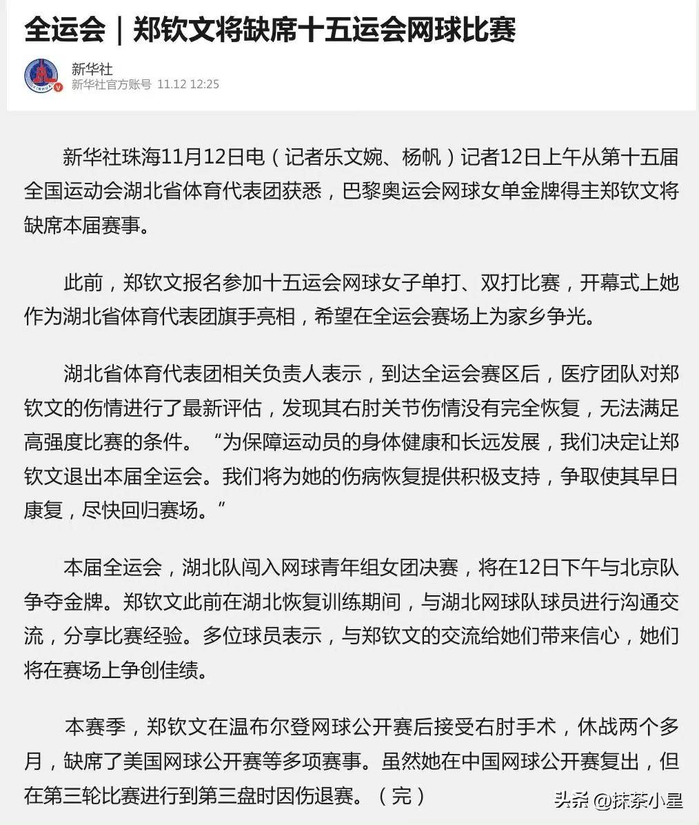 在全运会开幕式的运动员入场仪式上,郑钦文作为湖北队旗手亮相,她挥舞旗帜的英姿让人印象深刻,既美丽又充满力量。但尽管她原本报名了女单和女双两个项目,最终还是未能如约参赛。湖北省体育代表团随后回应称,郑钦文到达全运会赛区后,医疗团队对她的右肘伤情进行了重新评估,发现她的伤势尚未完全恢复,无法承受高强度比赛,因此决定退出比赛。