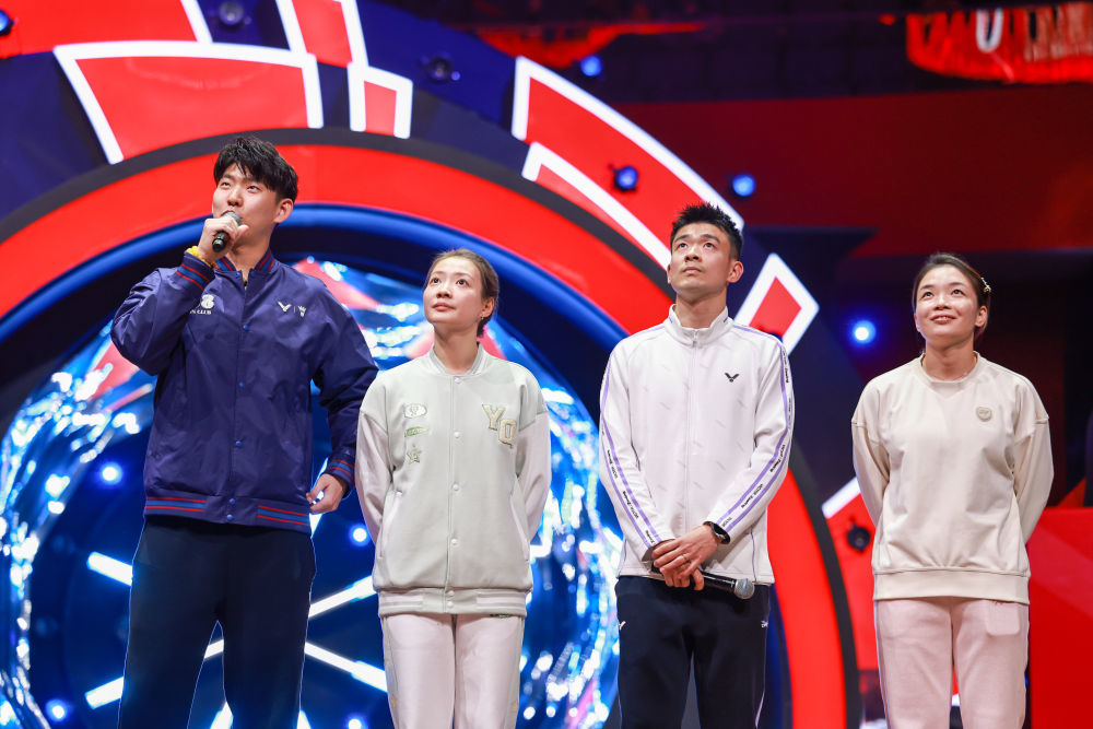 12月21日,刘雨辰、黄雅琼、郑思维、陈清晨(从左到右)在退役仪式上。新华社记者 江汉 摄