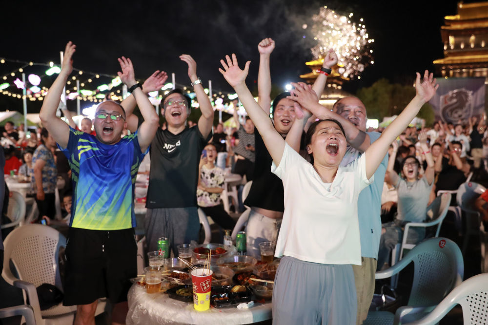 7月20日,球迷在淮安市漕运门广场观看“苏超”淮安队对阵无锡队的比赛。新华社发(徐昌政 摄)