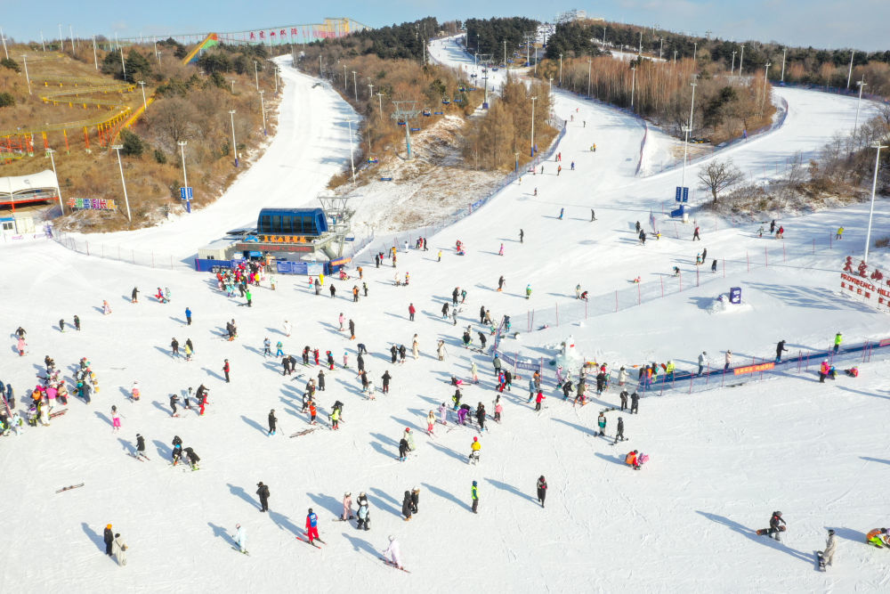 12月3日,学生和家长们在长春市天定山滑雪场滑雪(无人机照片)。新华社记者 张楠 摄