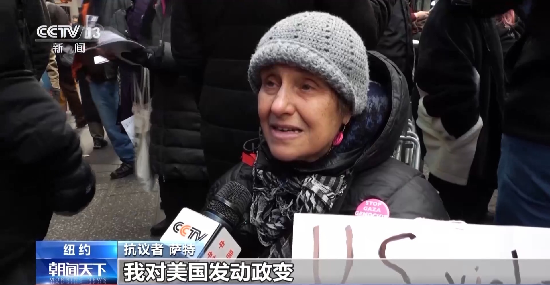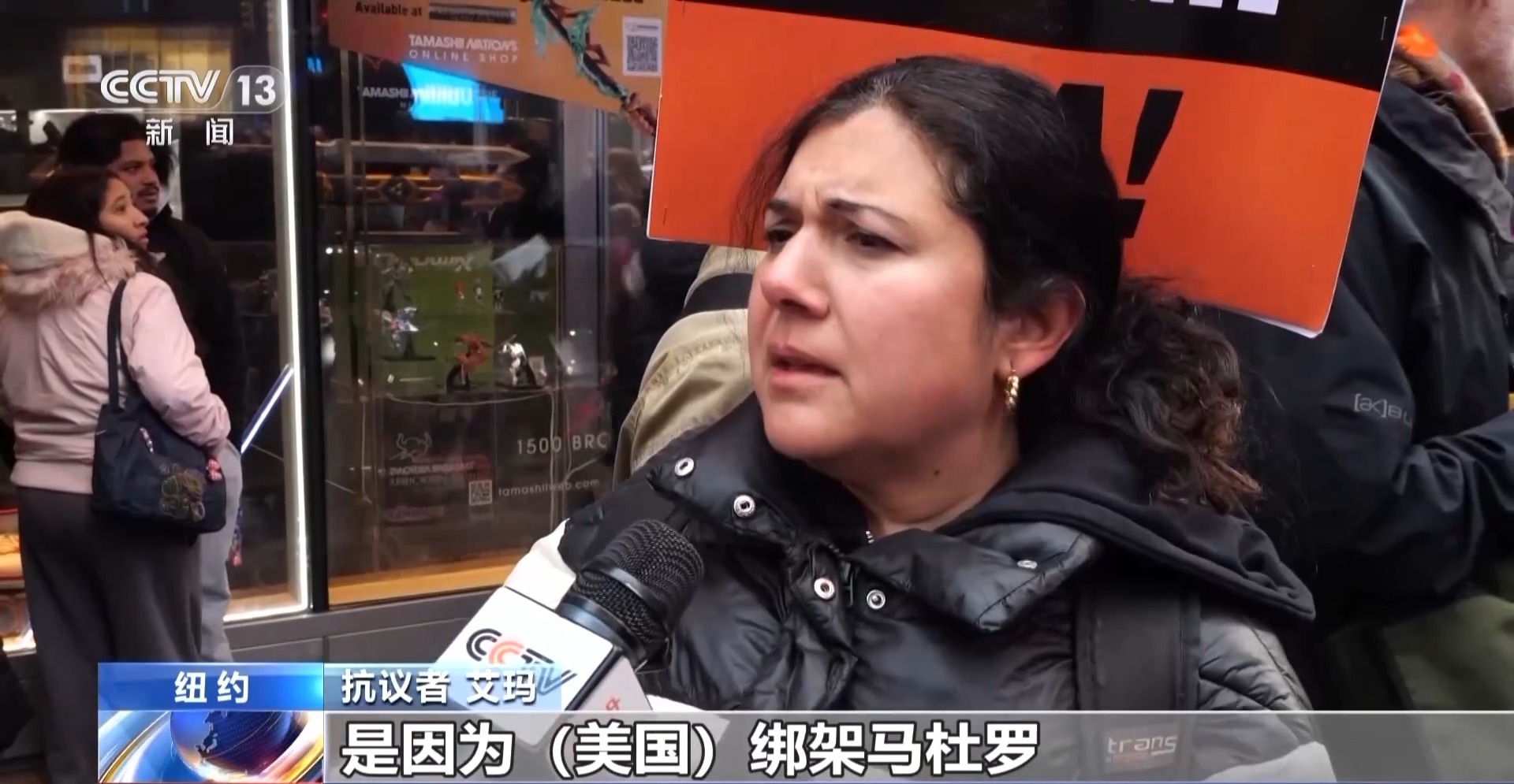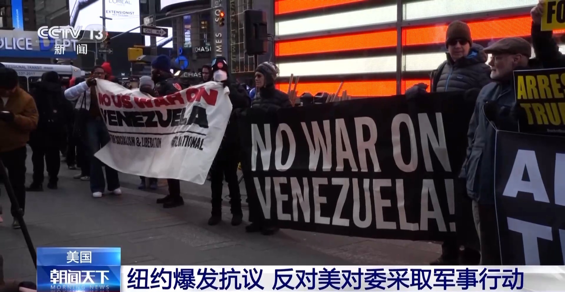 央视记者 许弢:当地时间1月3日,在美国对委内瑞拉采取军事行动后,全美多地都爆发了抗议活动。在广场,数百人聚集在这里,反对美国对委内瑞拉采取军事干预。