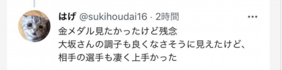看到大坂直美的失利,有网友为她感到惋惜称,“很希望看到(大坂直美)拿金牌,很遗憾。大坂的状态看起来不太好,而且对手表现很出色”。