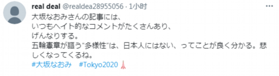 在赛后,有冷静的日本网友说道,“与大坂直美相关的报道(评论栏)中,每次都充斥着仇恨言论,令人泄气。奥林匹克中强调多样性,但从这件事中可以看出,其在日本人心中并不存在。令人感到悲伤”。