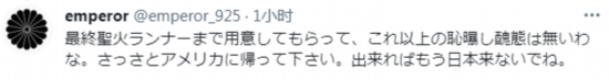 不过由于大坂直美是混血儿,3岁开始就在美国生活,有一部分日本网友对她的态度十分刻薄,有日本网友辱骂称,“之前给你准备了点燃主火炬的大任,没有比(止步第三轮)更加耻辱的丑态了,赶紧滚回美国吧。可以的话不要再来日本”