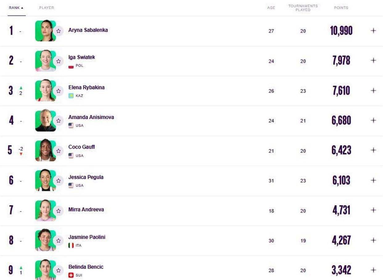 前十名中出现了两张“新”面孔。瑞士名将本西奇上升两位来到第九,她的上升主要得益于在澳网闯入八强的稳定表现。而最大的惊喜来自乌克兰的斯维托丽娜,这位妈妈级选手在产后复出的道路上越走越稳,本次澳网一举打入四强,排名飙升两位,时隔一年半重新杀回世界前十,位列第十。她在晋级路上击败了包括高芙在内的三位种子选手,其坚韧的防守和关键时刻的大心脏,让年轻一代的进攻手们感到头疼。