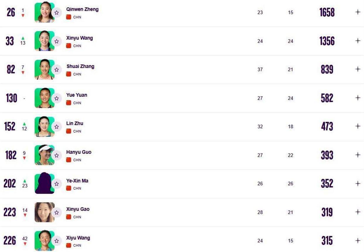 而在资格赛中折戟的袁悦、王曦雨等人,排名均有不同程度的下滑。袁悦排在第130位,王曦雨则下滑42位,排到了第226位。中国女网的梯队竞争,因为核心球员的伤病和年轻球员的起伏,呈现出一种充满变数的格局。